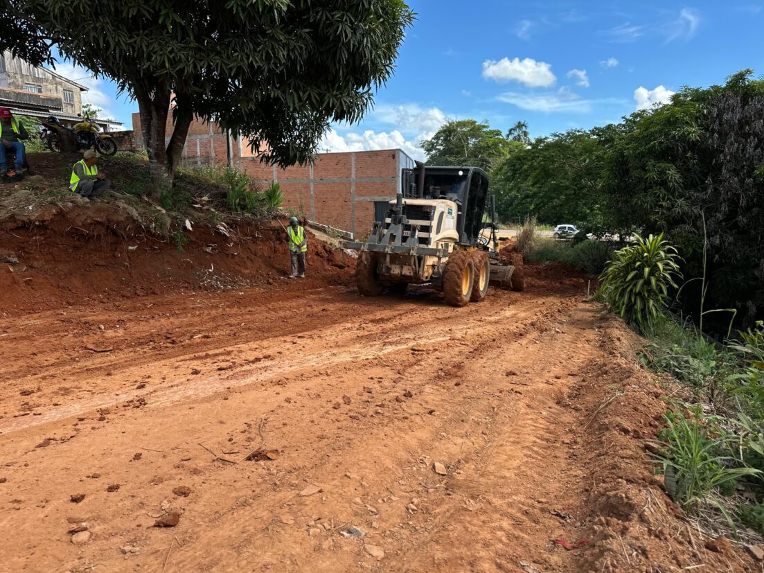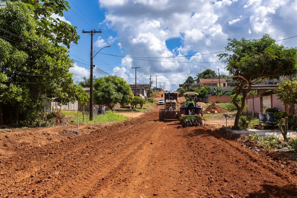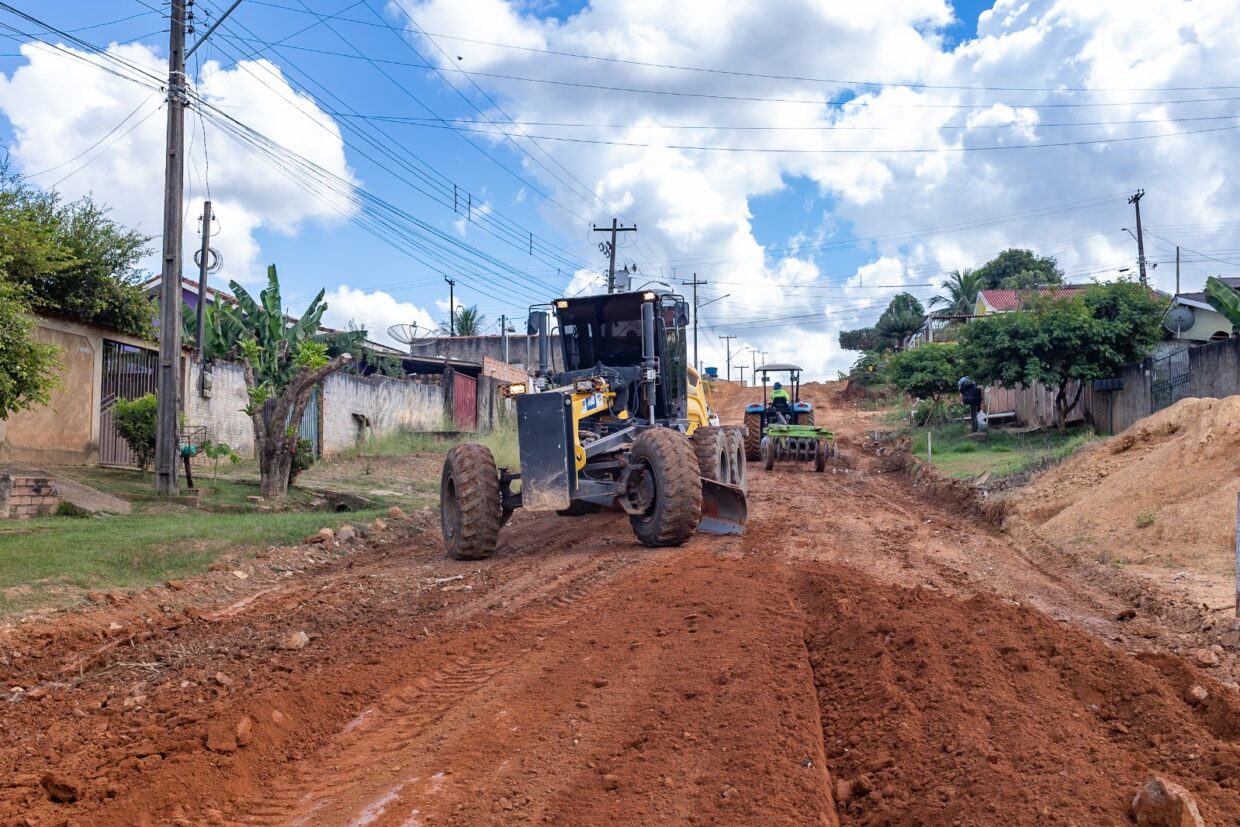 Prefeitura de Jaru realiza remoção de pedras e rebaixamento de morro na Rua Francisco Pantoja; serviço faz parte do processo de pavimentação da via