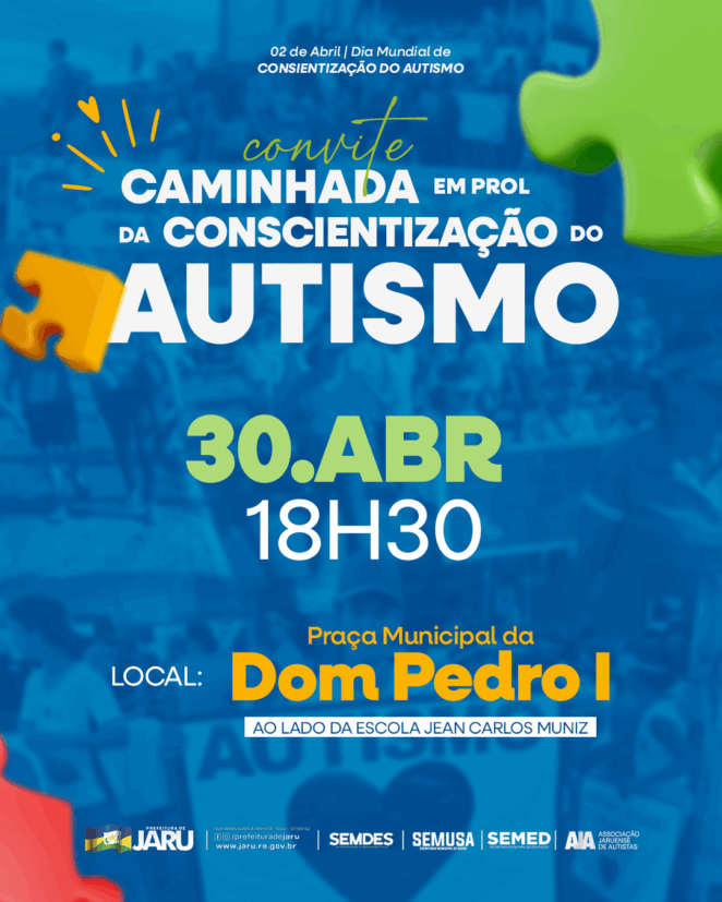 A Prefeitura de Jaru, por meio da Secretaria Municipal de Desenvolvimento Social – Semdes e da Associação Jaruense de Autistas – AJA, realizará no próximo dia 30 de abril uma caminhada especial que marcará o encerramento das atividades da campanha de conscientização sobre o Transtorno do Espectro Autista (TEA).