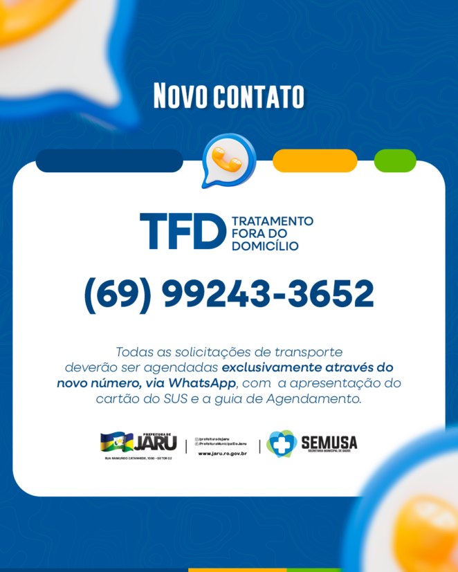 A Secretaria Municipal de Saúde de Jaru – Semusa, informa que o contato para agendar o transporte de pacientes em Tratamento Fora de Domicílio (TFD) foi atualizado.