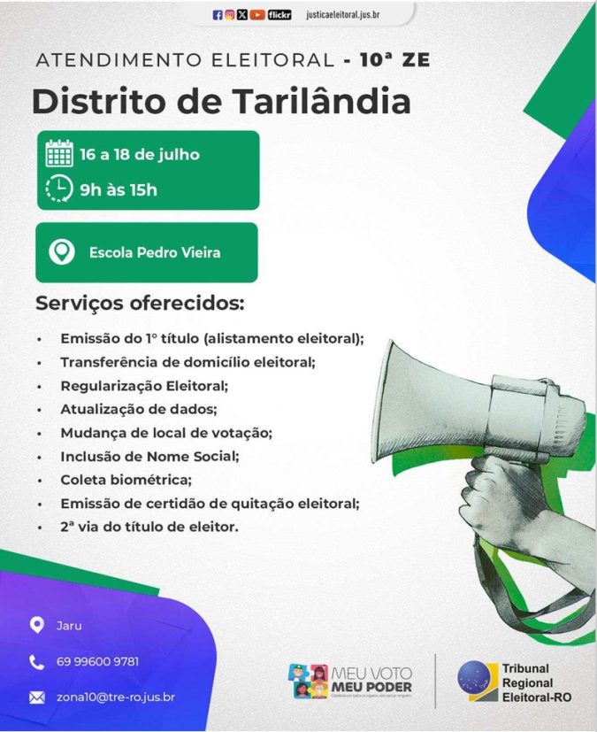 A 10ª Zona Eleitoral de Jaru segue com as ações itinerantes a partir da próxima segunda-feira, 14, em Jaru-Uaru. Os atendimentos também serão realizados em Tarilândia, Bom Jesus e Santa Cruz.