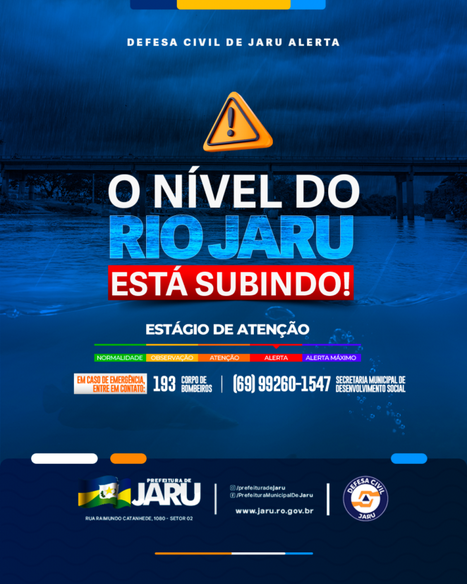 A Defesa Civil de Jaru, emitiu na manhã desta quarta-feira (26), o alerta vermelho para o risco de alagamento nas áreas próximas ao Rio Jaru.