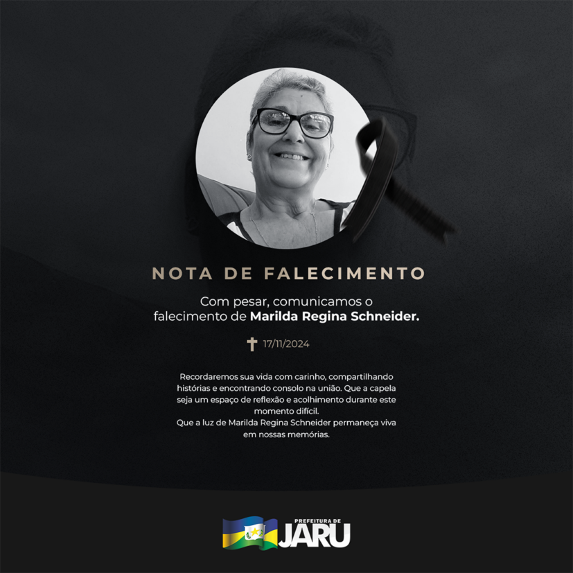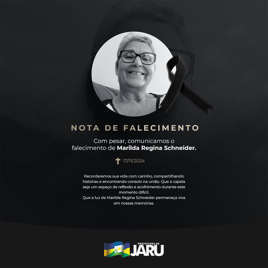 É com pesar que lamentamos o falecimento da servidora pública aposentada da Prefeitura de Jaru, Marilda Regina Schneider, 63 anos de idade.