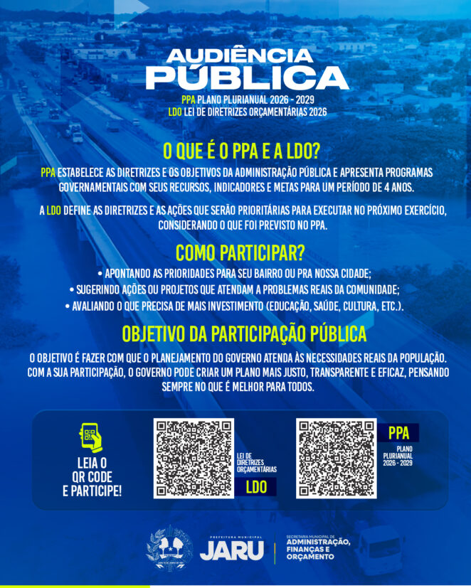 A Prefeitura de Jaru promove durante o período de 12 a 15 de maio uma rodada de audiências para consulta pública que ajudarão a elaborar o Plano Plurianual (PPA) 2026-2029 e a Lei de Diretrizes Orçamentárias (LDO) referente ao ano de 2026, conforme determina o artigo 48 da Lei Complementar nº 101/2000 – Lei de Responsabilidade Fiscal.