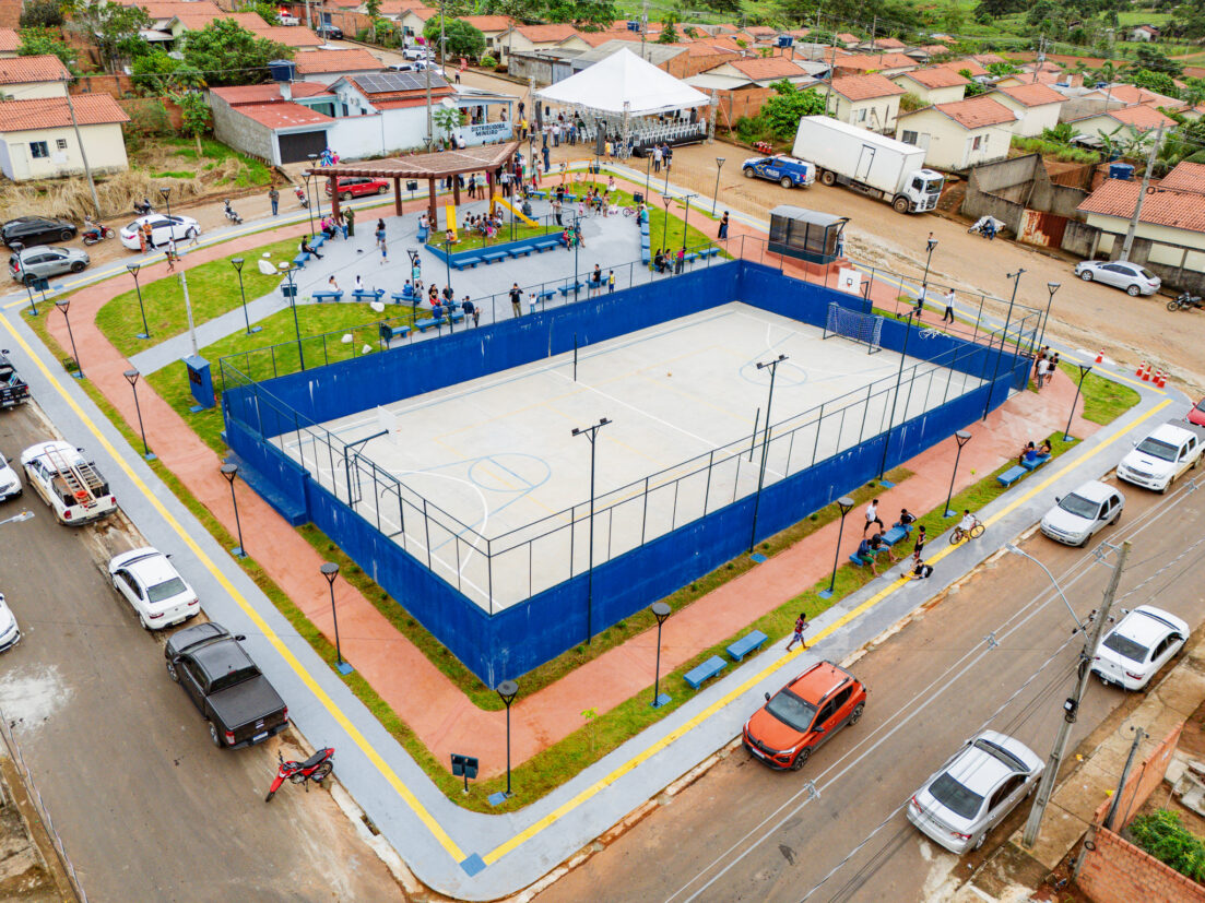 O espaço possui, além da quadra poliesportiva, praça com pergolados, brinquedos, bancos, ponto de ônibus coberto, iluminação de LED e jardinagem.
