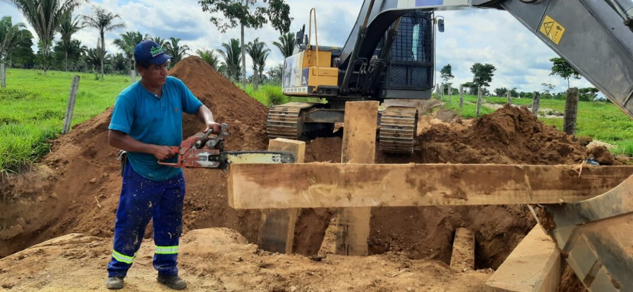 Entre as várias frentes de serviço em andamento, equipes da Secretaria Municipal de Infraestrutura e Serviços Públicos de Jaru – Seminsp, atuam na região de Tarilândia, onde trabalham na recuperação de duas pontes.