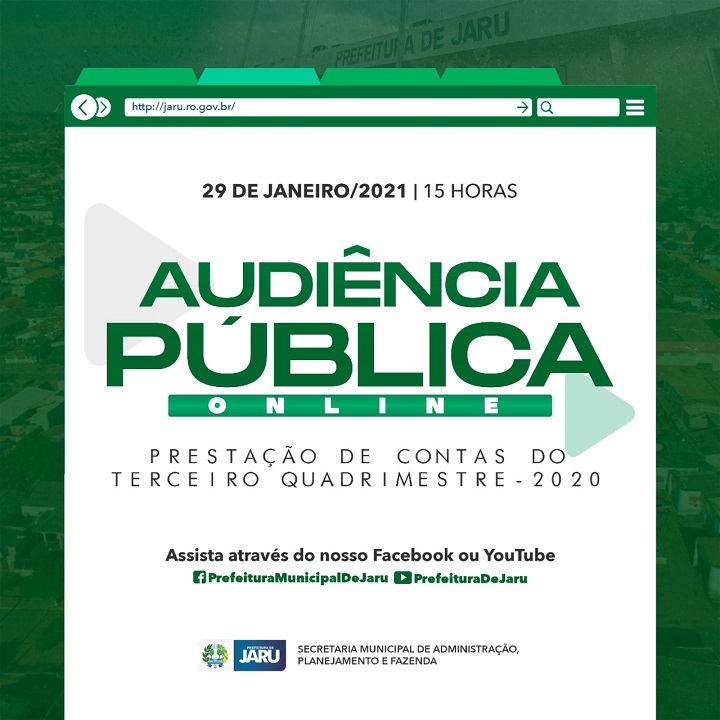 A prefeitura de Jaru, convida toda a população para acompanhar na próxima sexta-feira (29) a Audiência Pública para a prestação de contas do 3º quadrimestre de 2020.