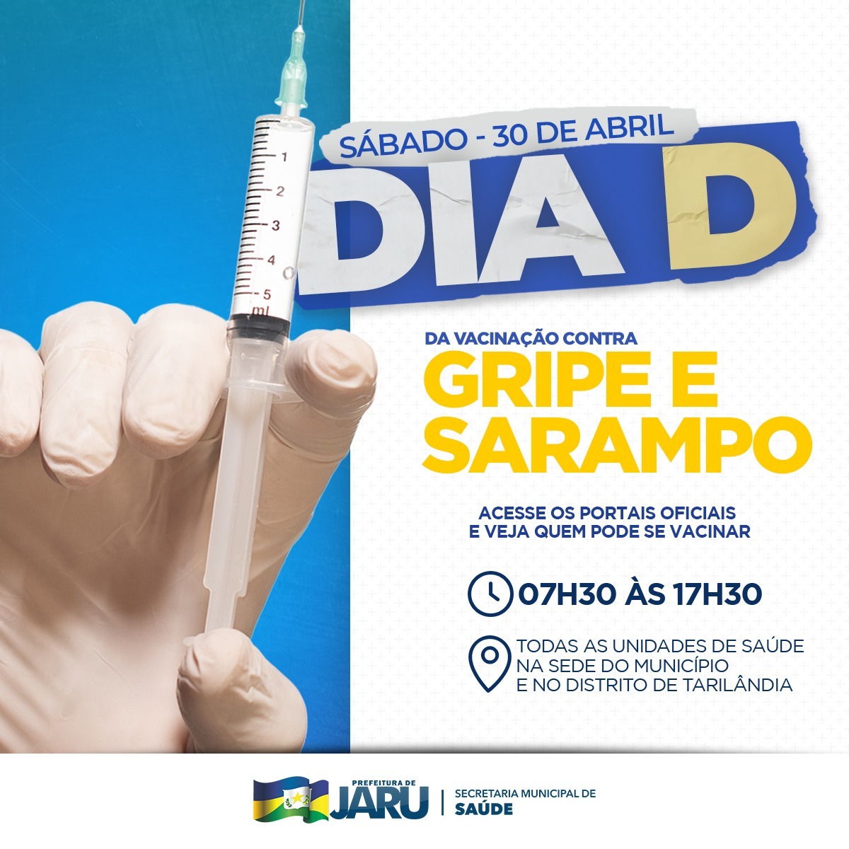 A Secretaria Municipal de Saúde de Jaru – Semusa, promoverá no próximo sábado (30), um mega mutirão de imunização com a oferta de vacinas contra a Gripe H1N1, Sarampo, COVID-19 e atualização da caderneta de vacina da criança.