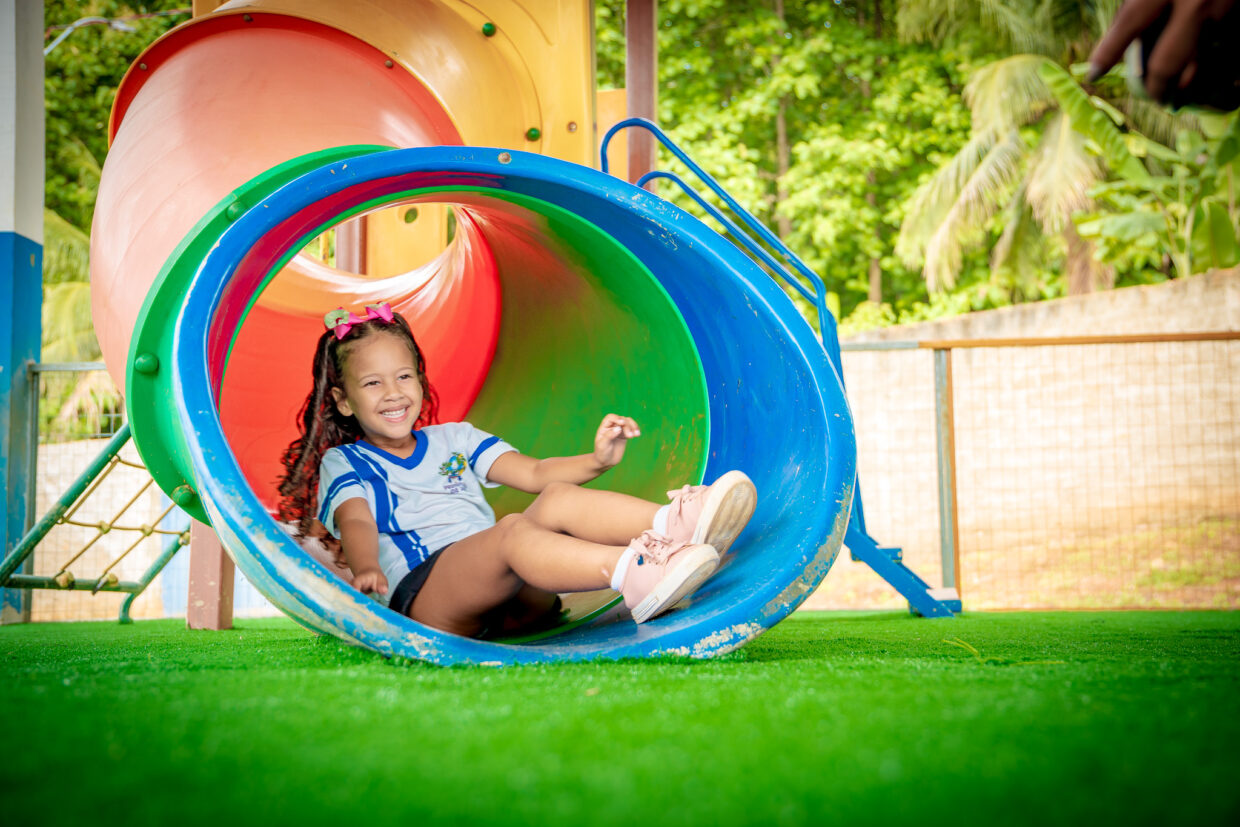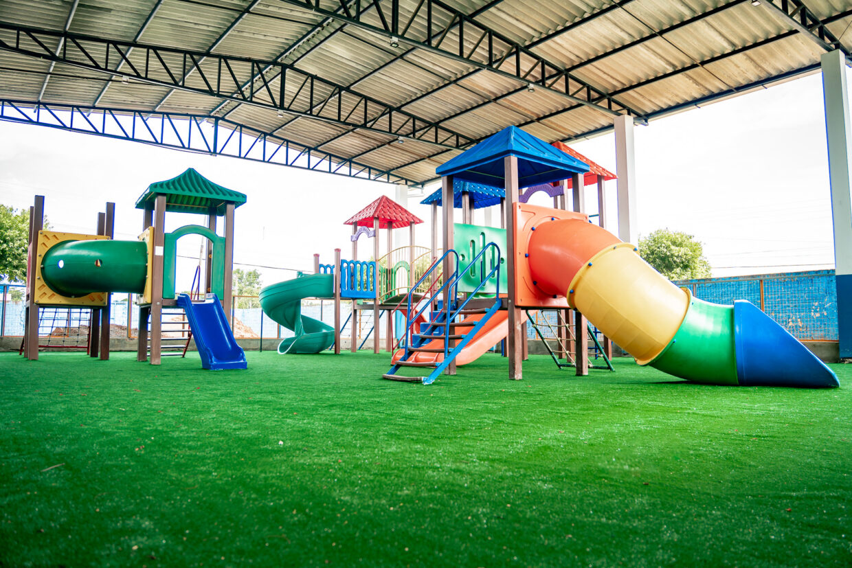 Nas demais áreas de lazer dos colégios da rede municipal de educação infantil e fundamental, foi feito contrapiso e aplicação de grama sintética, para maior conforto e segurança das crianças que utilizam os espaços.