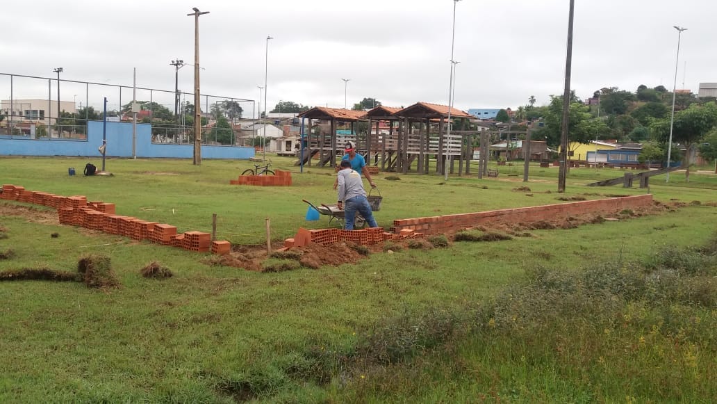 No local está sendo feito a base de tijolos para demarcação da área da quadra, que posteriormente será preenchida com a areia.