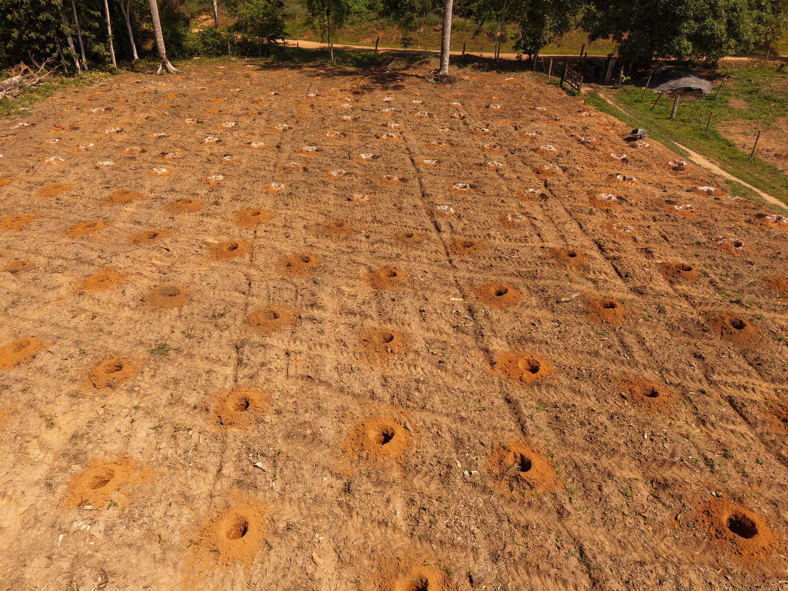 Na propriedade do senhor Ivanildo, foram escavadas 2.200 covas, além do transporte das mudas de cacau e de 10 toneladas de cama de frango, utilizada como adubo orgânico para melhorar a fertilidade do solo.