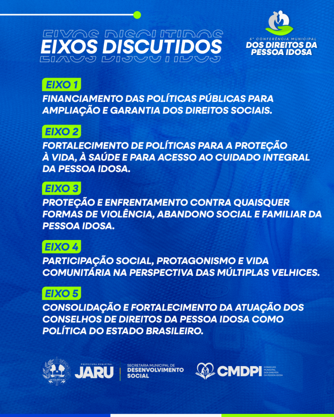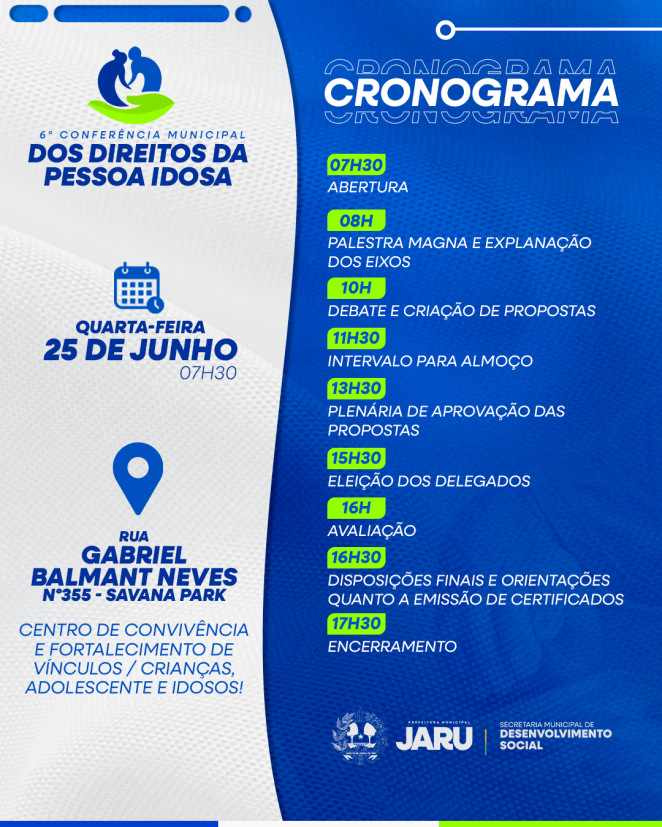 A Prefeitura de Jaru, por meio da Secretaria de Desenvolvimento Social – Semdes, realizará no dia 25 de junho, a 6º Conferência Municipal de dos Direitos da Pessoa Idosa.