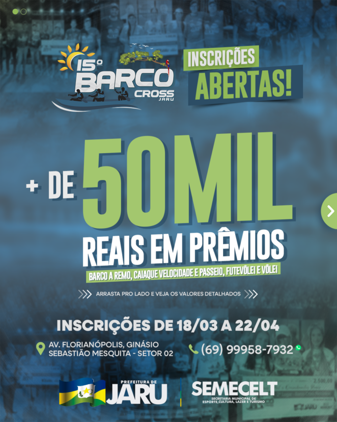 A prefeitura de Jaru trabalha nos últimos ajustes para a realização da 15ª edição do Barco Cross, o evento acontecerá nos dias 03 e 04 de maio e contará com disputas de barco a remo (masculino e feminino), futevôlei (misto), vôlei de areia (masculino e feminino) e caiaque nas modalidades velocidade e passeio (misto).